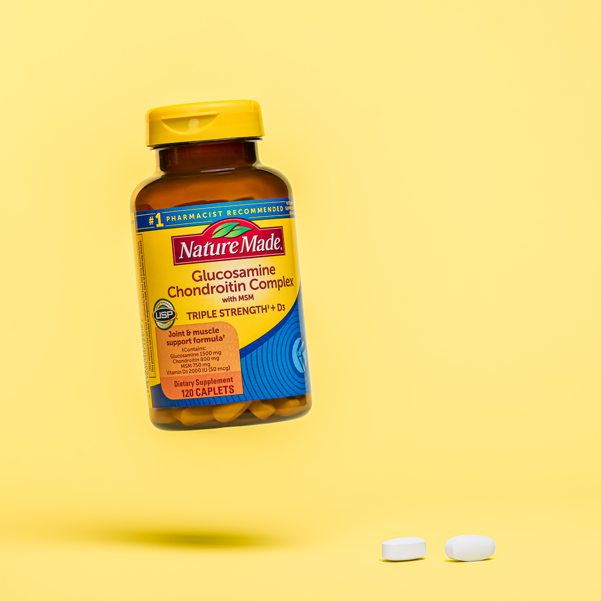 Nature Made® Glucosamine Chondroitin with MSM (popularly known as Triple Flex®) plus D3 is a joint and muscle support formula. Our Triple Strength‡ formula contains 1500 mg of Glucosamine to help support healthy cartilage and 800 mg of Chondroitin to help keep your joints moving smoothly by helping to support joint cushioning, with 750 mg of MSM, which is a source of dietary sulfur, a trace element used by the body in collagen, connective tissue, and joint cartilage. This dietary supplement also includes 50 mcg (2000 IU) of Vitamin D3 to support bone, teeth, and muscle health.†